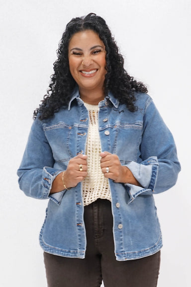 Experience elevated denim with our Staple Denim Jacket in Medium Wash. This versatile piece showcases a collared neckline, functional front buttons...