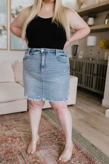 Add a trendy and edgy touch to your wardrobe with the Gigi High Rise Rigid Magic Denim Skirt! Its high rise and raw cutoff hem give it a stylish an...