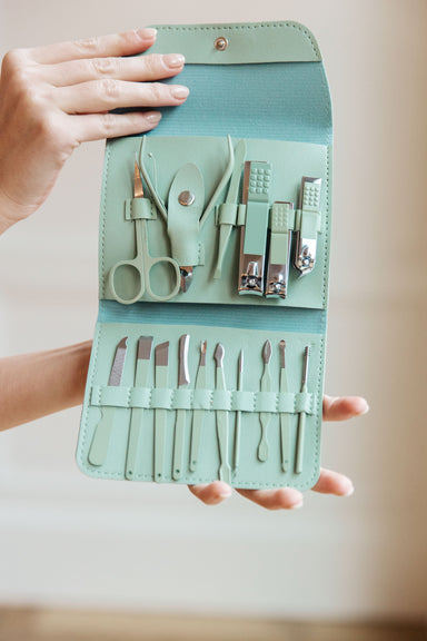 Our Flawless 16 pc Mani-Pedi Set - the ultimate companion for your DIY nail care adventures! This handy set comes tucked in a sleek faux leather ...